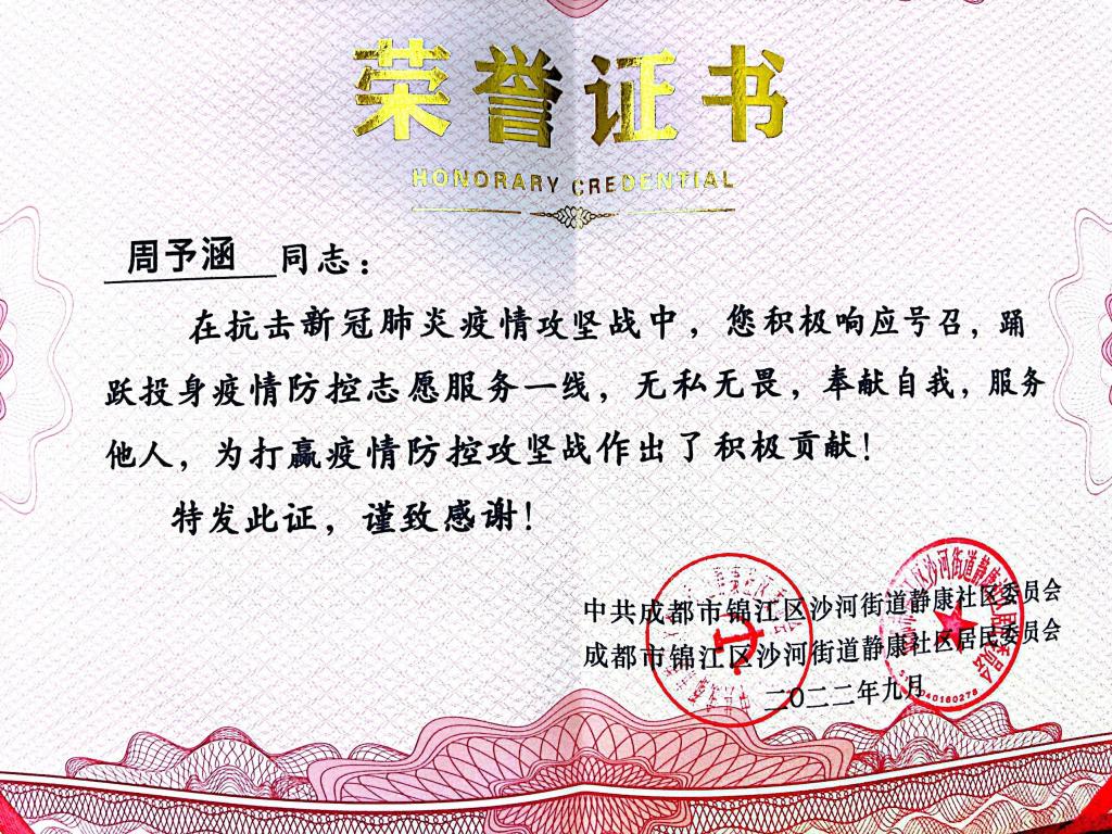 周予涵同学在战“疫”中的优秀表现,获得了服务社区的高度肯定,先后荣获都市沙河街道静康社区颁发的荣誉证书,简阳市射洪坝街道新合社区“最美志愿者”荣誉称号。