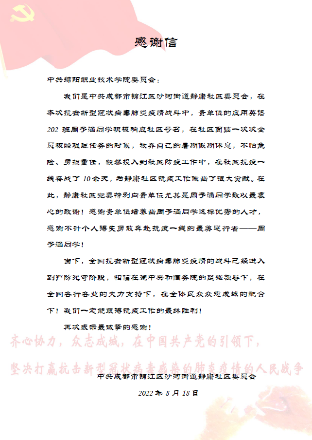 近日,成都市沙河街道静康社区党委向公司寄来感谢信,信中赞扬mk体育应用英语202班员工周予涵,在四川成都“7.20”和“8.25”两场疫情防控阻击战中,积极投身志愿服务工作,彰显了新时代老员工的责任与担当,对公司人才培养和思政教育的成效表示肯定。