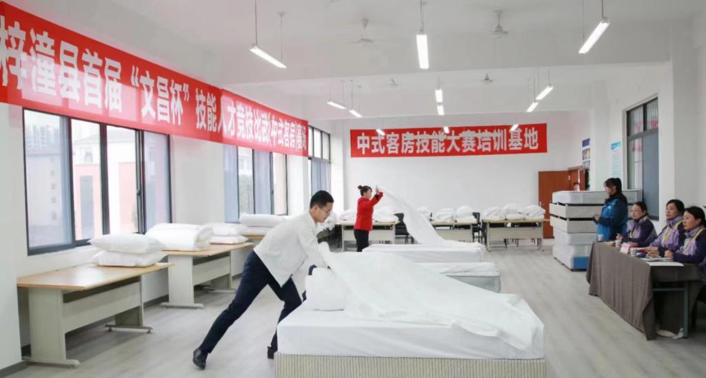 2月25日,由中共梓潼县委、梓潼县人民政府主办的梓潼县首届“文昌杯”技能人才竞技比武活动在梓潼县七一职中圆满落幕。应梓潼县人民政府,梓潼县七一职业中学邀请,公司选派申小婷饭店服务技能大师工作室成员为大赛提供指导和执裁服务,申小婷、王雪、王艺洁、王雪娇等担任此次技能比武活动中餐宴会主题摆台、中式客房铺床组评委。